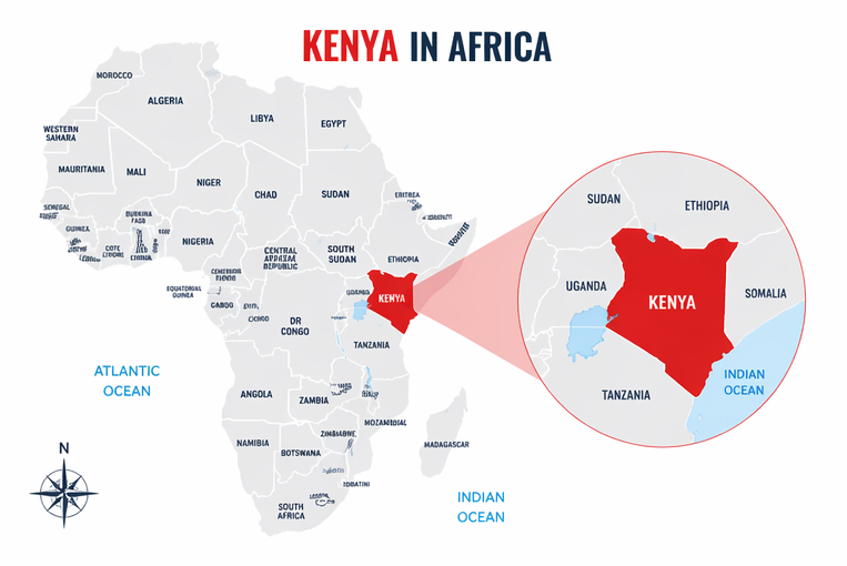 Kenya is located in East Africa, bordering Tanzania, Uganda, South Sudan, Ethiopia, Somalia, and the Indian Ocean.